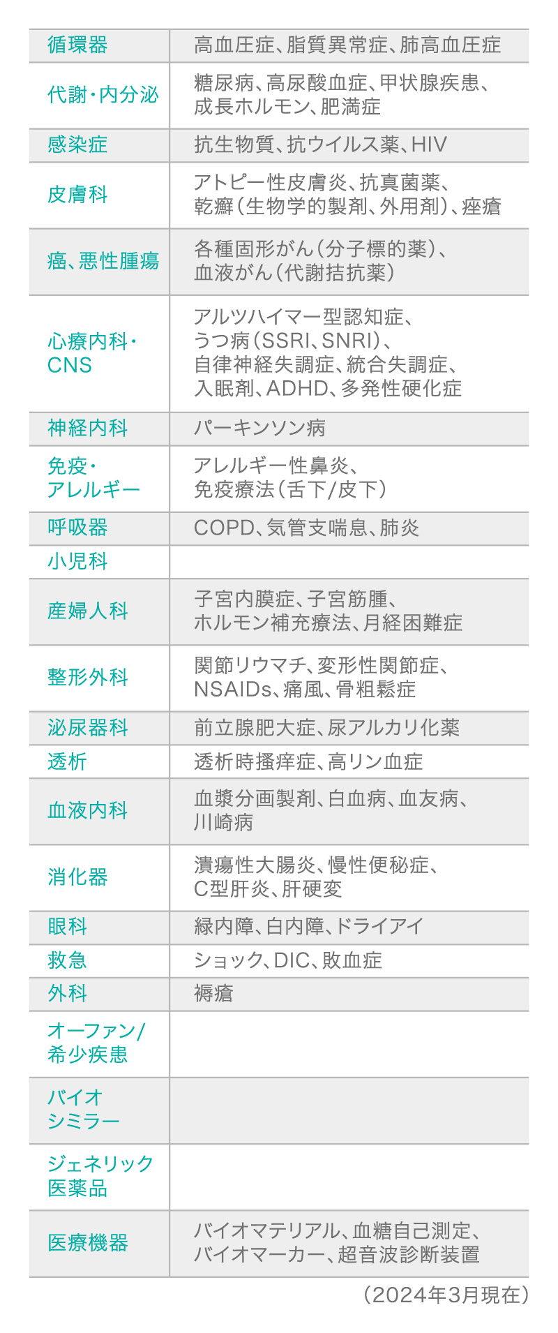小野薬品工業、大塚製薬、第一三共、大鵬薬品、持田製薬、塩野義製薬、東レ、日本たばこ産業、鳥居薬品、科研製薬、日本化薬、ヤクルト本社、Meiji Seikaファルマ、興和、EAファーマ、あすか製薬、ニプロ、日本血液製剤機構、日本ケミファ、ノーベルファーマ